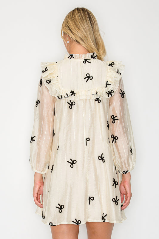 • Model wearing the Organza Bow Long Sleeve Mini Dress, a cream-colored dress with a large ruffle collar, bishop sleeves, and black velvet bow details.
