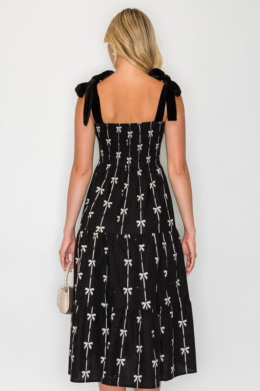 • Model wearing the Holiday Bow Midi Dress, a black midi dress with a bow print, smocked bodice, and velvet tie-shoulders.