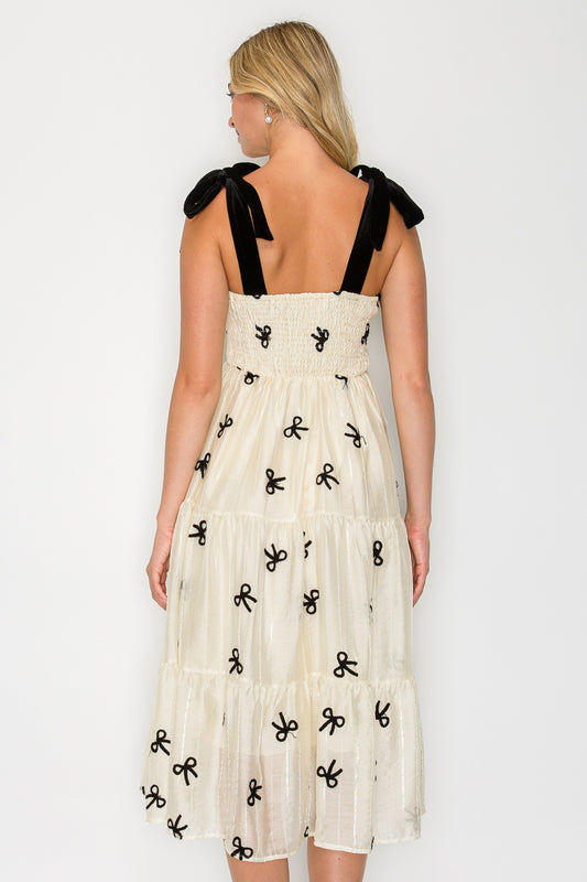 • Model wearing the Organza Bow Velvet Tie Midi Dress, a cream-colored dress with a smocked bodice, velvet tie-shoulders, and a tiered midi skirt.