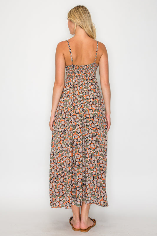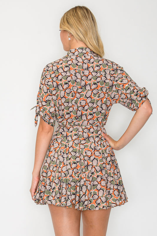 • Model wearing the Autumn Pebble Shirt Dress, a printed mini dress with a collar, smocked waist, and tie-details on the sleeves.