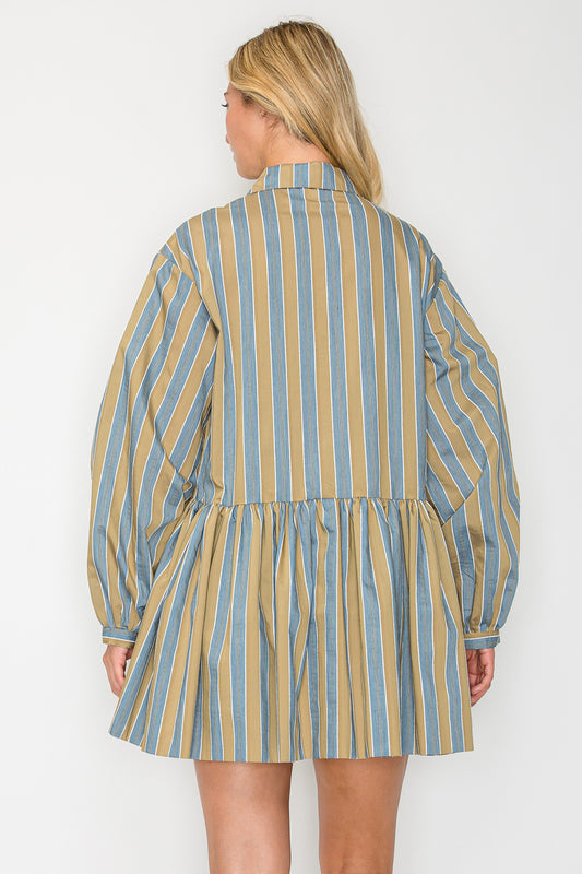 • Model wearing the Hazel Fall Stripe Long Sleeve Dress, a blue and tan striped mini dress with a collar, long bishop sleeves, and a drop-waist silhouette.