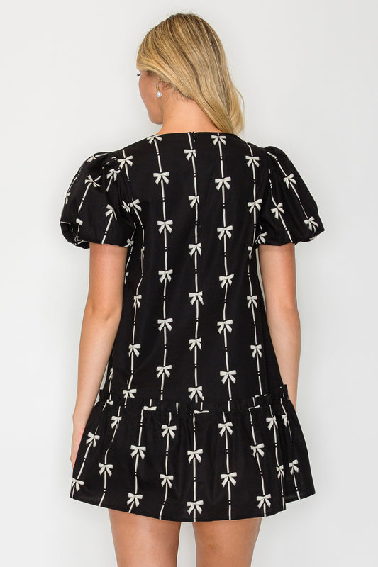 • Model wearing the Holiday Bow Mini Dress, a black dress with a cream bow print, puff sleeves, and a drop-waist ruffle hem.
