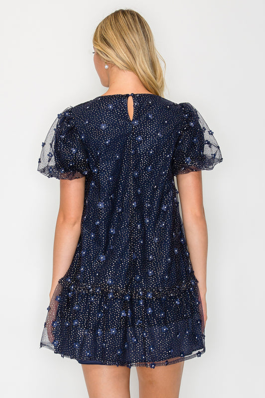 • Model wearing the Holiday Daisy Puff Sleeve Mini Dress, a navy tulle dress with embroidered daisies, puff sleeves, and a drop-waist ruffle hem.