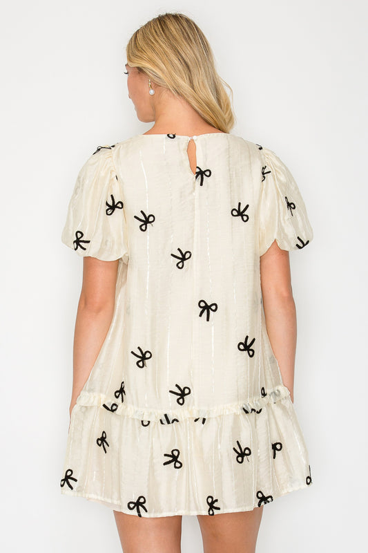 • Model wearing the Organza Bow Puff Sleeve Mini Dress, a cream-colored dress with black velvet bow details, puff sleeves, and a drop-waist ruffle hem.