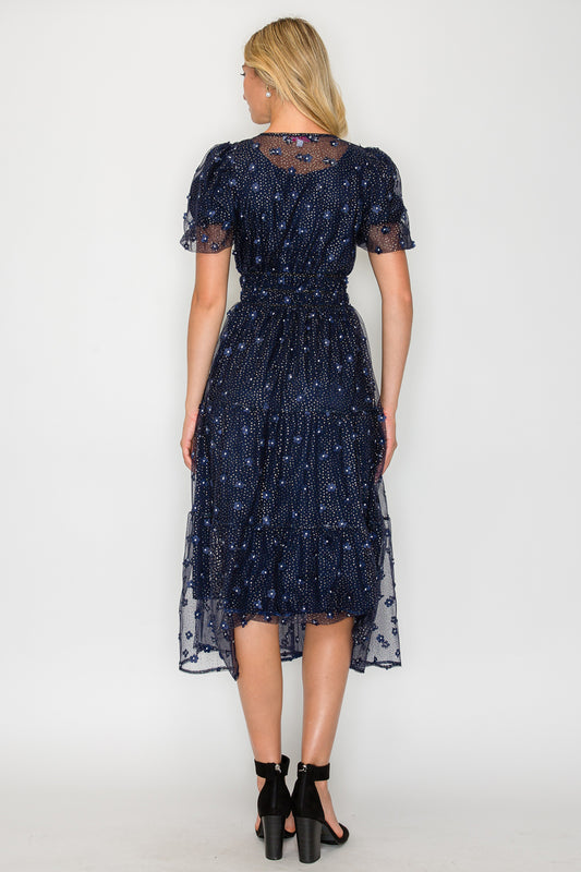 • Model wearing the Holiday Daisy Midi Dress, a navy tulle dress with embroidered daisies, a V-neck, puff sleeves, and a tiered midi skirt.