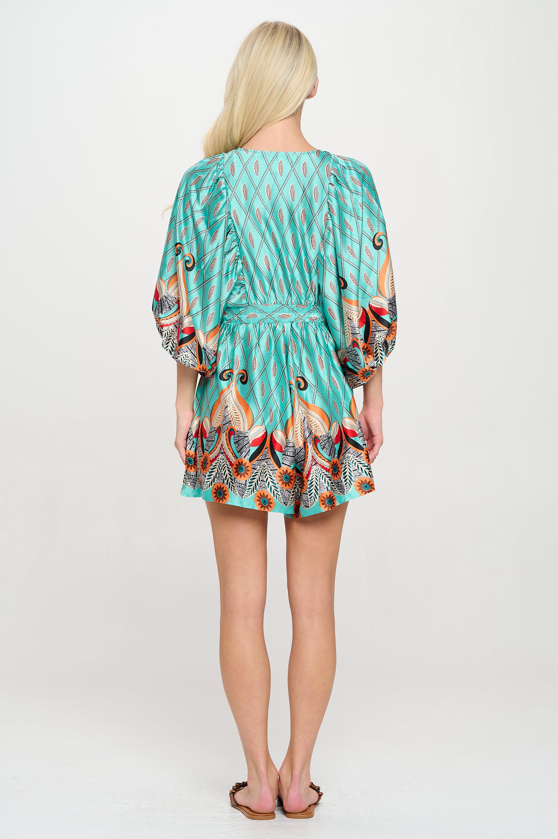 Channel resort-ready glamour with the Feather Teal Romper. An easygoing yet eye-catching one-piece crafted for poolside lounging or sunlit getaways. Featuring a vivid feather motif in oceanic hues and a flowy silhouette, this romper is designed with a flattering V-neckline framed by ruched detailing and breezy dolman sleeves. The elastic waist offers a cinched shape without sacrificing comfort. Complete with a bold border print at the hem, it’s a vacation wardrobe essential that’s effortlessly chic and endlessly wearable.