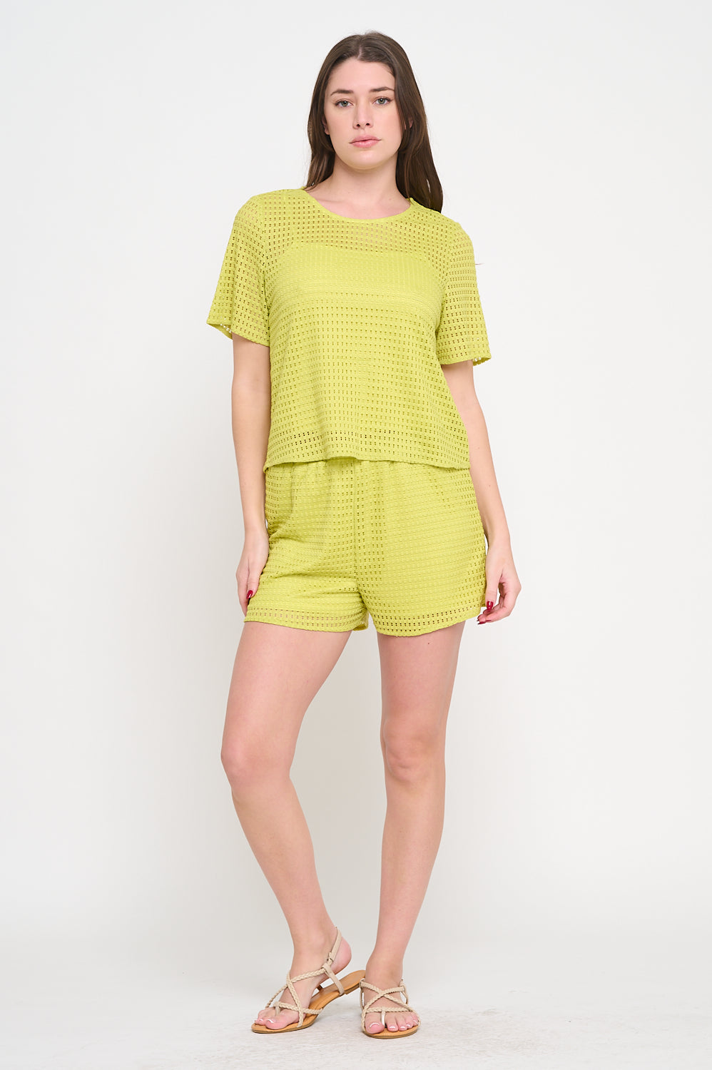 Upgrade your boutique with this must-have 2-piece eyelet lounge set, designed for both comfort and effortless style. This versatile set includes a relaxed-fit short-sleeve top paired with matching high-waisted shorts, perfect for warm-weather layering, casual outings, or lounging in style. The breathable eyelet fabric adds a chic yet airy touch, making it a go-to piece for vacation, resort wear, or everyday fashion.