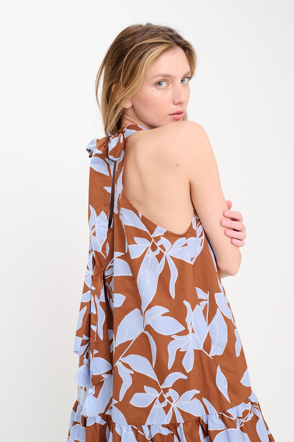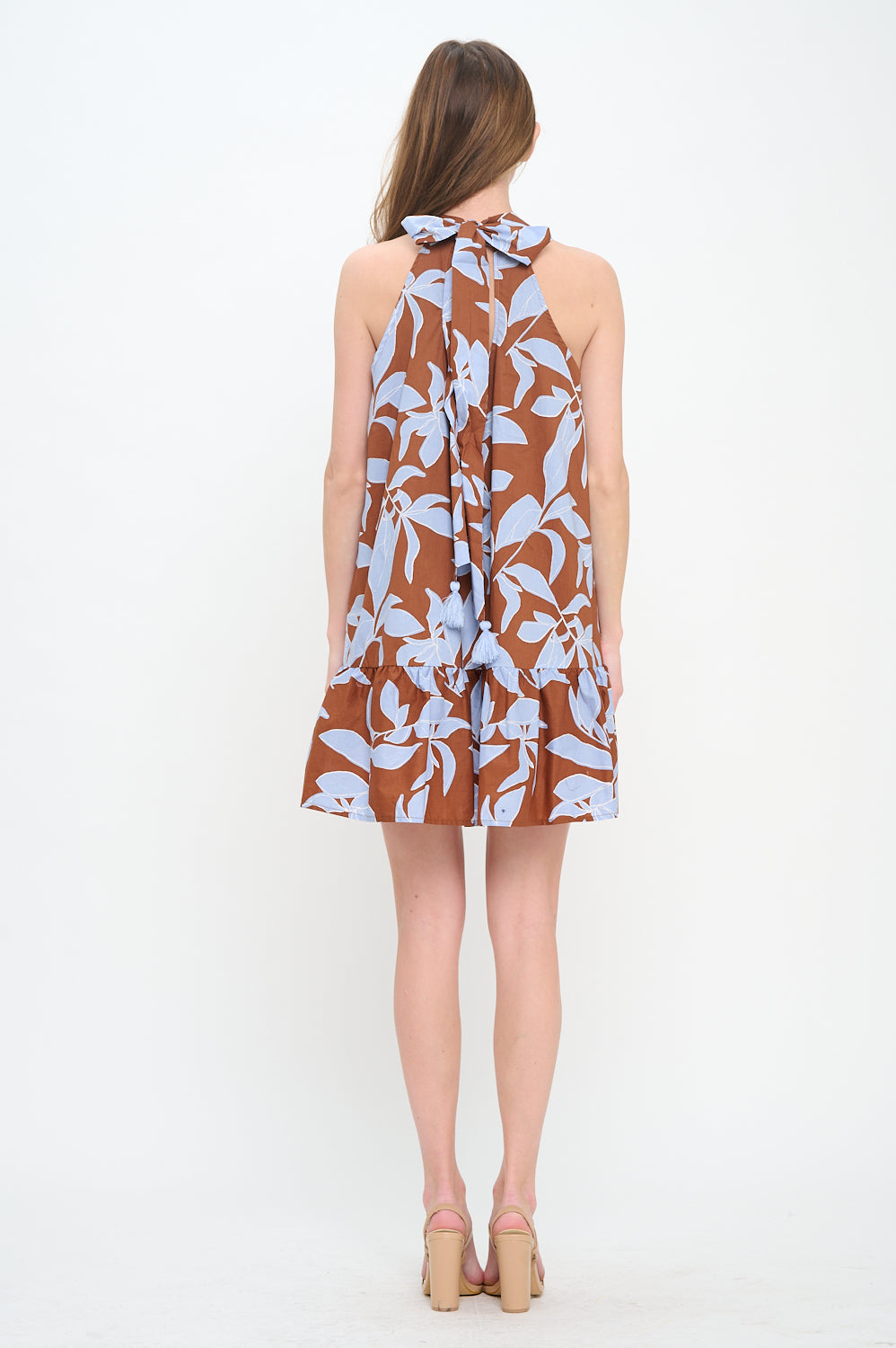 Make an effortlessly chic statement in the Rosey Haze Halter Dress, a playful mini that blends bold print with breezy elegance. Crafted from soft woven fabric, it features a high halter neckline with subtle gathers, creating a flattering drape that moves beautifully with you. The relaxed shift silhouette is finished with a ruffled hem for a touch of flirty charm, making it perfect for brunch by the coast, rooftop cocktails, or sun-drenched getaways. Pair it with strappy heels for an elevated look or keep it casual with flat sandals. Light, airy, and versatile, this dress is designed to keep you stylish from day to night with ease.