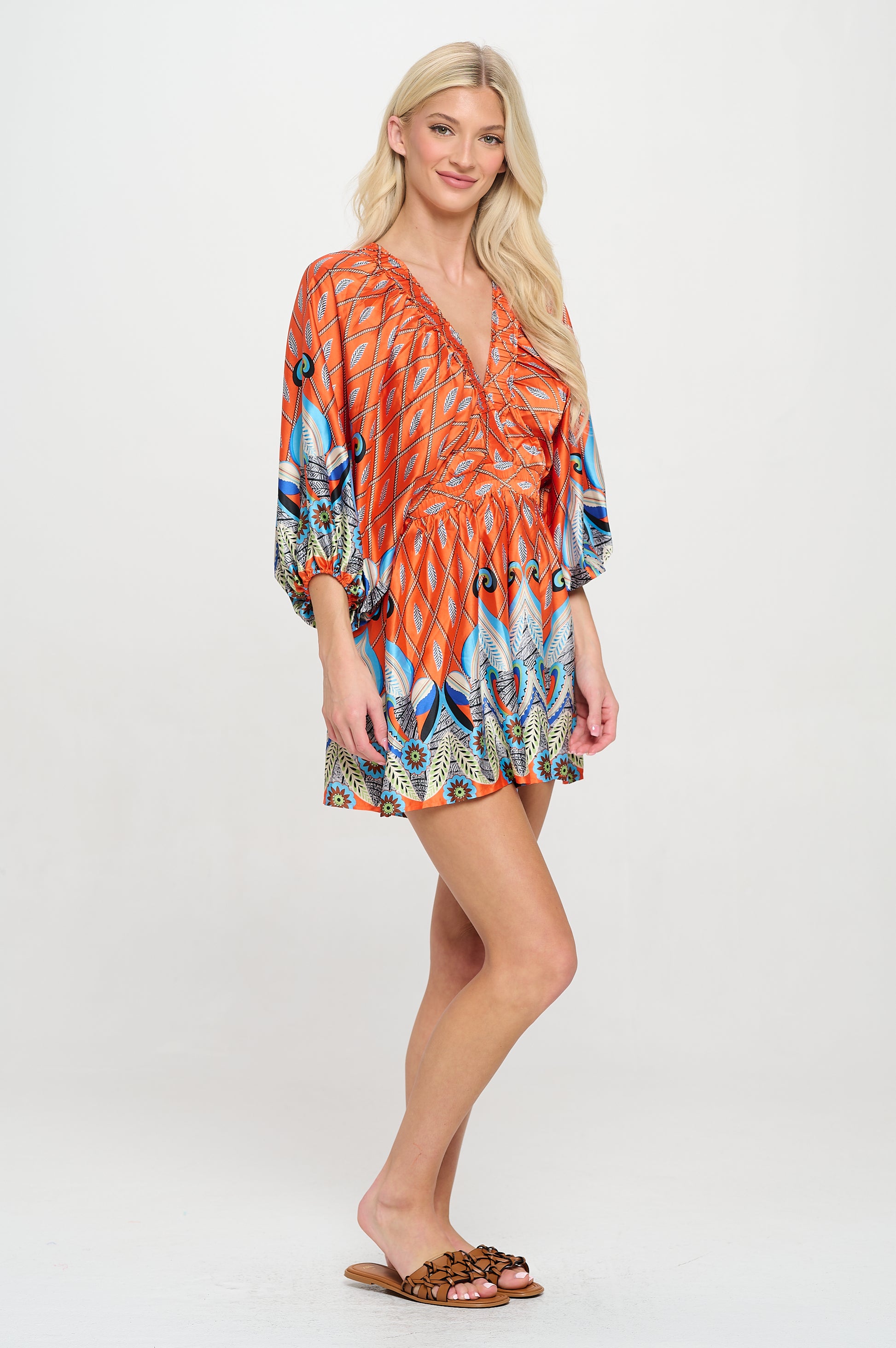 Vibrant and full of movement, the Saffron Paralia Romper captures the spirited energy of summer on the Aegean coast. Designed in a silky, lightweight fabric that drapes beautifully, this bold printed romper features a plunging V-neckline with delicate ruffle trim, billowy 3/4 balloon sleeves, and a cinched elastic waist for effortless definition. The wide, flared shorts give the illusion of a mini dress. Perfect for breezy getaways, seaside cocktails, or sunset soirees. With a colorful palette inspired by Mediterranean mosaics, this women’s resortwear standout is equal parts playful and polished.